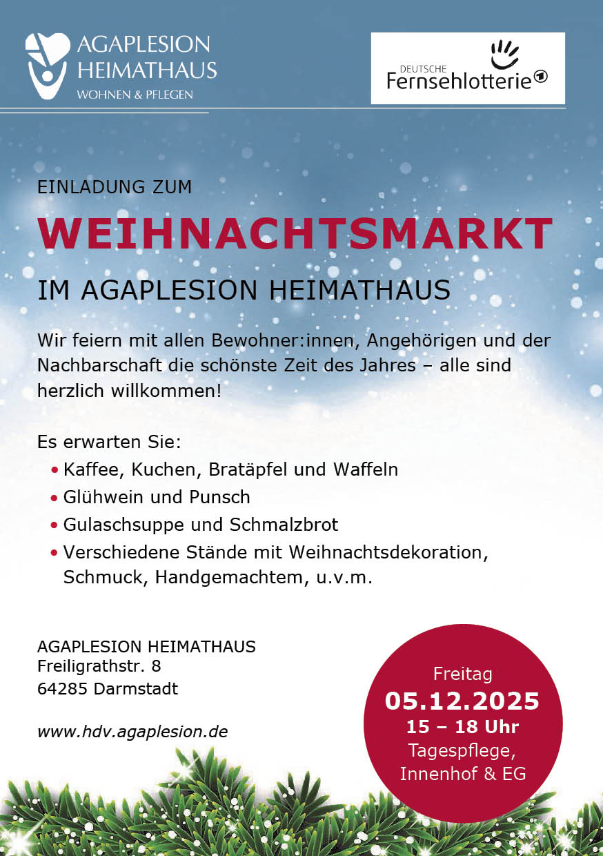 Einladung zum Weihnachtsmarkt im AGAPLESION HEIMATHAUS in Darmstadt-Bessungen.